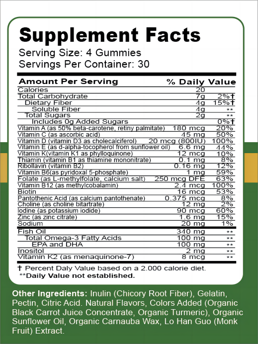 優(yōu)質(zhì)的多功能補(bǔ)充劑,提供來(lái)自魚(yú)油的Omega-3、用于消化的益生元纖維和必需營(yíng)養(yǎng)素,包括維護(hù)骨骼的維生素 D3、支持能量代謝的維生素 B12 和葉酸。